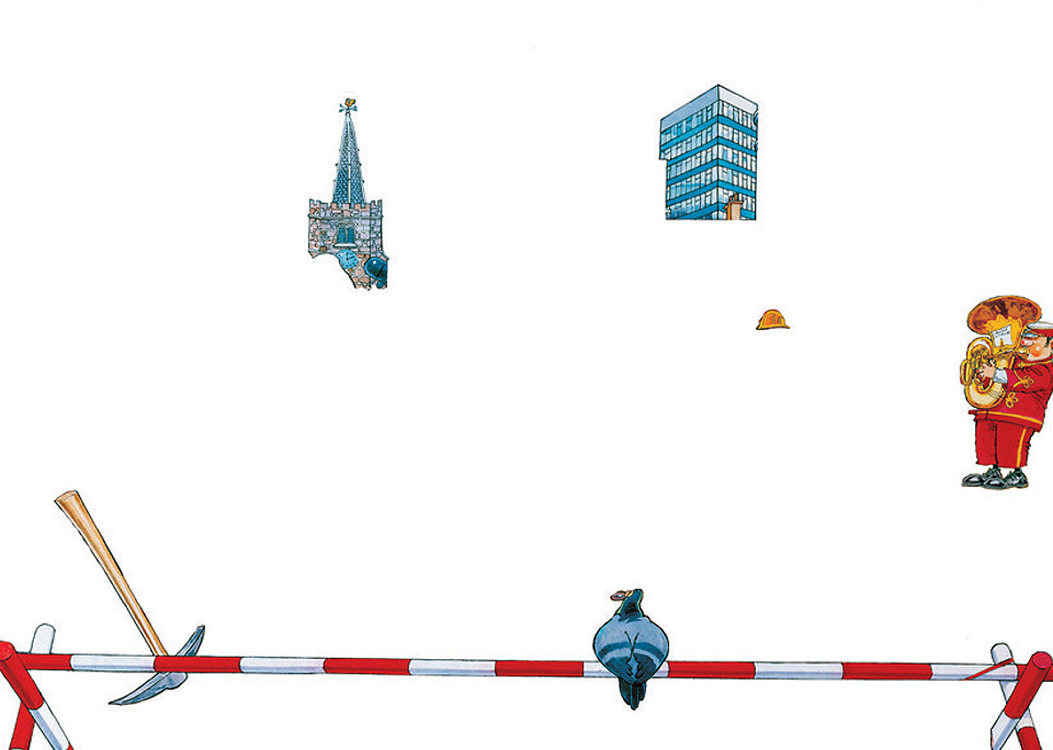 Imagine you are the sweet old lady whose grin is from ear to ear and try to imagine what she’s smiling about beyond the red and white barrier that the hungry birds are perching on – that is what you are puzzling.