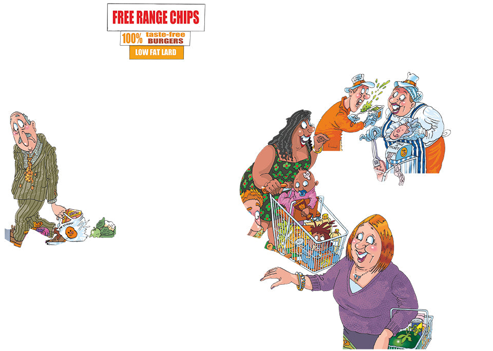 Früher mussten die Käufer im vollen Tante-Emma-Laden lange warten, bis sie bedient wurden, aber ist das Einkaufen im modernen Supermarkt eigentlich viel besser? Versuche dir vorzustellen, du bist das Mädchen im geblümten Pullover, das Süßigkeiten kauft. Wie werden all diese Leute in der Zukunft, wenn sie erwachsen ist, die Einkäufe erledigen? Und ist sie dann noch immer so verrückt nach Süßigkeiten? Das ist die Abbildung, die du puzzeln musst.