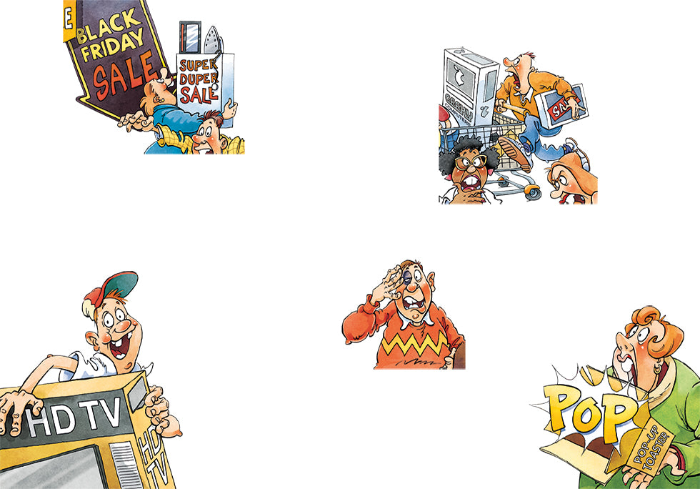 Le centre commercial pris d'assaut par les clients pendant le coup d'envoi de la période des achats de fin d'année : le fameux Black Friday. Il offre une multitude de produits en soldes mais aussi, si on en juge par la foule massée à l'extérieur qui n'en croit pas ses yeux, des promotions encore plus attractives ! Mais pourquoi son directeur a-t-il lui aussi l'air stupéfait ? Est-il ébahi par le spectacle de toutes les soldes présentés à l’intérieur de son magasin ou le témoin d’un événement totalement inattendu ?